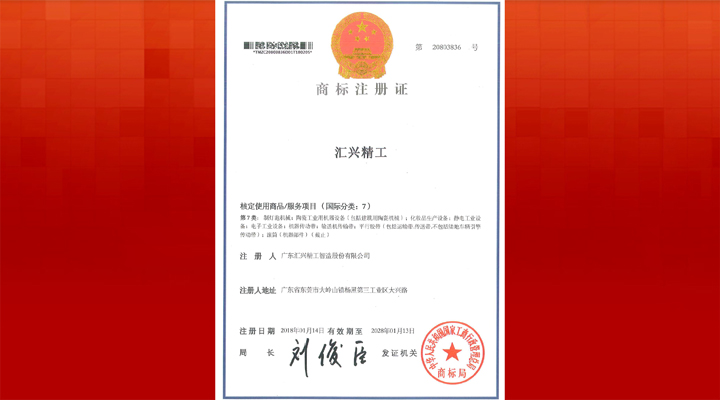 陽(yáng)春三月,萬(wàn)物復(fù)蘇。廣東匯興精工智造股份有限公司的喜訊就如鮮花綻放、嫩芽出頭,一個(gè)接一個(gè),讓人應(yīng)接不暇。3月13日,一份商標(biāo)注冊(cè)證書飄然而至。這為“匯興精工”的商標(biāo)注冊(cè)證書已經(jīng)是中華人民共和國(guó)國(guó)家工商行政管理總局商標(biāo)局為匯興智造簽發(fā)的第9份商標(biāo)注冊(cè)證書。 匯興智造立志成為中國(guó)領(lǐng)先的整廠自動(dòng)化系統(tǒng)解決方案提供商,一直不忘初心,不斷優(yōu)化產(chǎn)品質(zhì)量,堅(jiān)持研發(fā)攻克新技術(shù),打造開(kāi)發(fā)新產(chǎn)品,加速轉(zhuǎn)化新成果。在做大做強(qiáng)的過(guò)程中,強(qiáng)烈地意識(shí)到知識(shí)產(chǎn)權(quán)和品牌建立的重要性,所以,成立了知識(shí)產(chǎn)權(quán)部門,投入大量人力、財(cái)力來(lái)保護(hù)自主創(chuàng)新、知識(shí)產(chǎn)權(quán)和品牌構(gòu)建。 商標(biāo)注冊(cè),為匯興智造樹(shù)立了品牌、建立了口碑。在每一個(gè)匯興人心中都有一個(gè)愿望,那就是打造一個(gè)“百年老店”。“創(chuàng)于手 精于工 智于器 匠于心 品于行”是匯興智造奉行的工匠精神,匯興人在匯興工匠精神的影響下,勤修內(nèi)功、精益求精地培育著匯興人心中的“百年老店”。 “十年磨一劍”,匯興智造以提升品質(zhì)為根本,下大力氣做真正的好產(chǎn)品,由產(chǎn)品制造走向了產(chǎn)品智造,將向精品制造進(jìn)發(fā),提高品牌的含金量,做出 “匯興百年老店”的金字招牌。(轉(zhuǎn)載匯興智造http://www.huixinggroup.com)