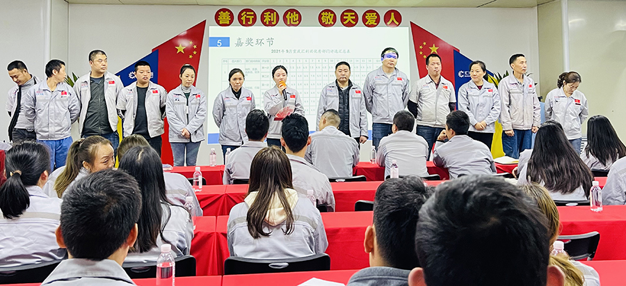 10月20日18點45分,匯利興西南工廠全體員工在匯利興學校召開9月月度會議,會議總結上月項目發展情況,規劃部署下月生產計劃,進一步推進公司戰略實施,由行政部主持。 會議前,由二位核心高管擊響士氣鼓,鼓舞士氣,凝心聚力,鼓舞著戰友們奮勇前進和堅決打勝仗的決心,并以這種以評促進、你追我趕的“激勵文化”,潛移默化融于員工的日常工作中。 宣讀企業文化,向文化三道孝道、商道、人道鄭重鞠躬,并對本月新入員工進行歡迎儀式。