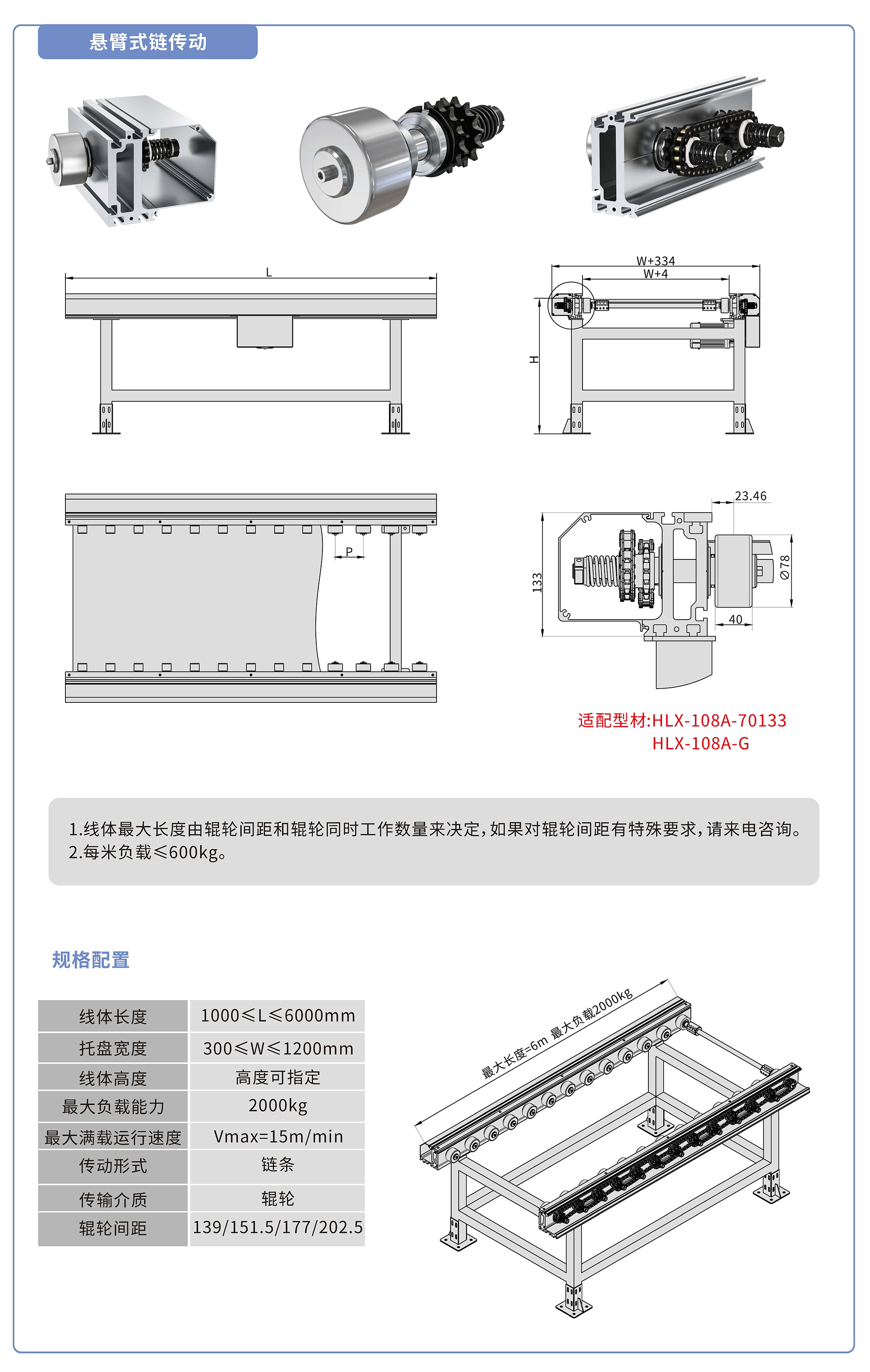 采用70133鋁型材,鏈輪傳動,鍍鉻滾輪鑲嵌銅套實現積放功能,負載2000kg/米,最大負載速度15M/min, 輪距139、151.5、177、202.5可選,適用托盤寬度300-1200mm,線體長度范圍1000-6000mm, 高度根據需求定制.