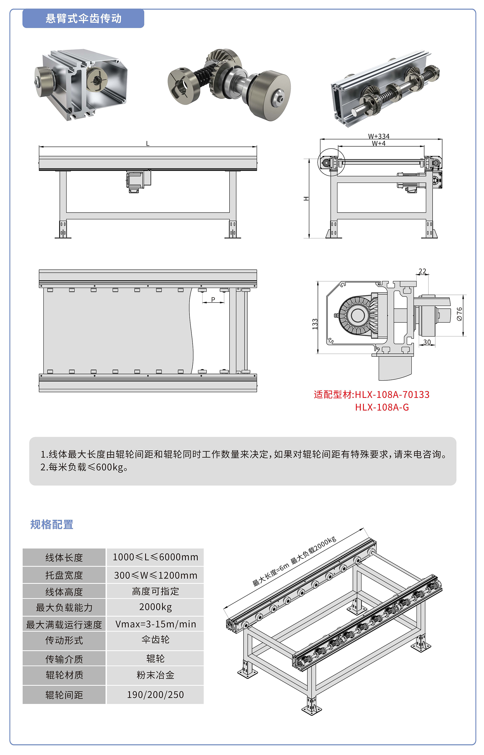 采用70133鋁型材,傘齒驅動,粉末冶金滾輪鑲嵌銅套實現積放功能,負載2000kg/米,最大負載速度15M/min, 輪距190、200、250可選,適用托盤寬度300-1200mm,線體長度范圍1000-6000mm, 高度根據需求定制.